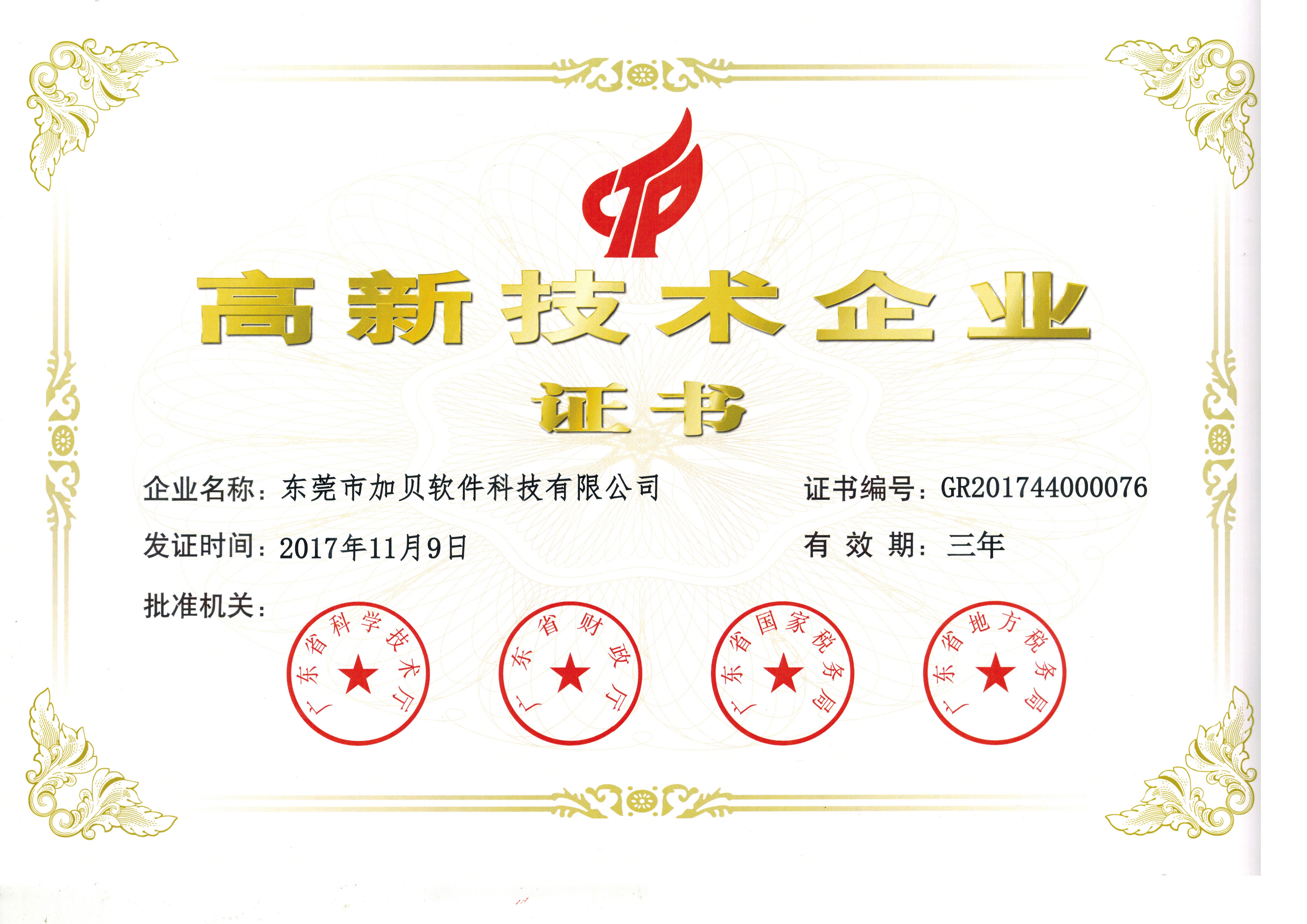 东莞加贝软件有限公司被评为“国家级高新技术企业”