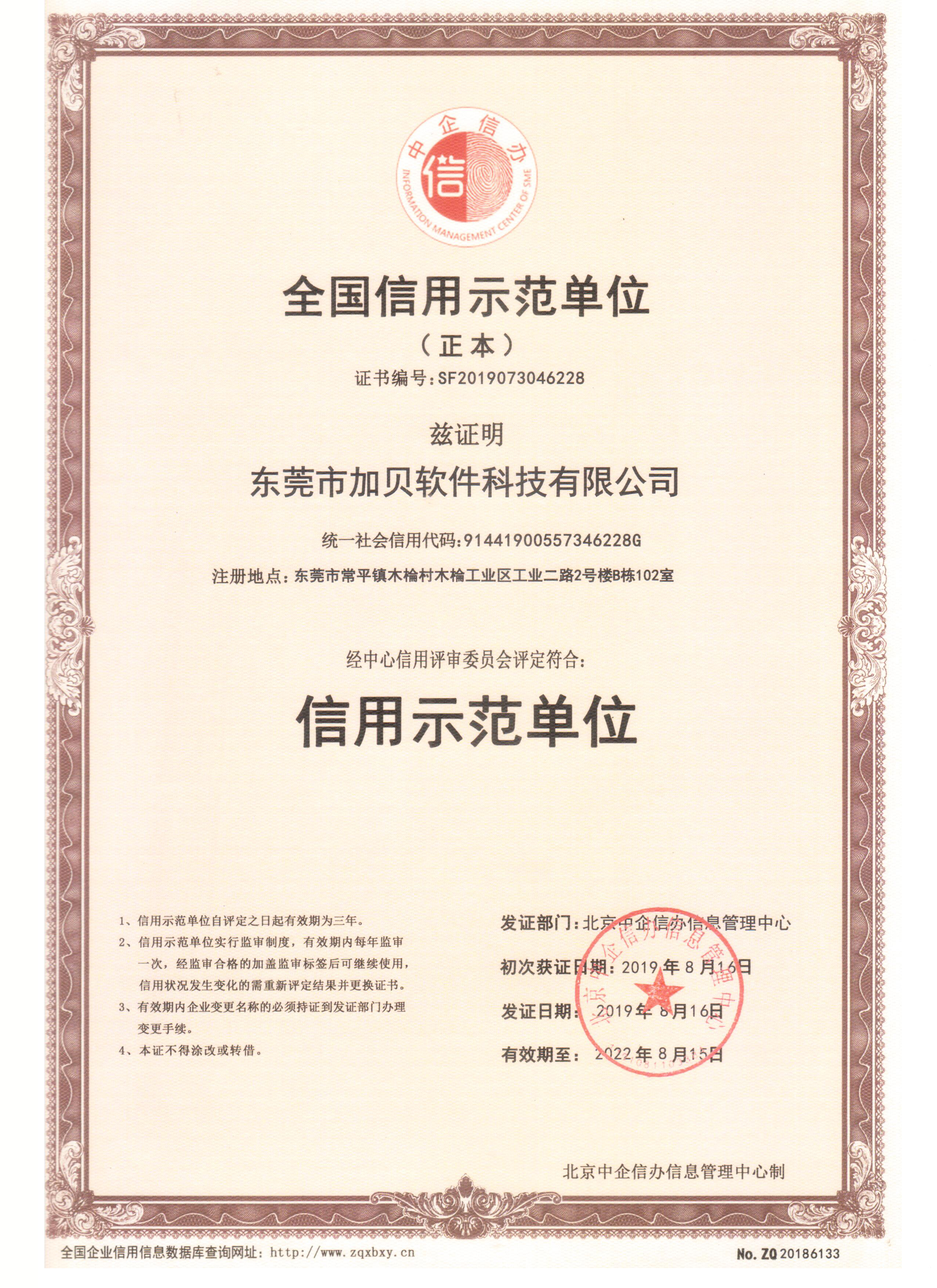 北京中企信办信息管理中心 8 月 15 日在中企信办上发布中国诚信企业示范单位,加贝软件凭借多年良好的业界口碑和优秀的服务品质荣获 2019-2022 年“中国软件诚信示范单位”荣誉称号。