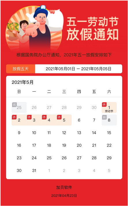 2021年五一劳动节即将来临,根据国务院《全国劳动节放假办法》的规定,并结合本公司(加贝软件)实际情况与工作安排,经公司研究决定,现将劳动节放假时间安排如下: